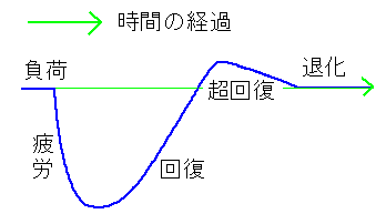 No14で述べたように、トレーニング負荷により、疲労が起こりパフォーマンスは低下し、安静により回復します。回復過程のうちさらに身体の能力が向上する超回復の状態となりその後元の状態に戻っていきます。(図1) 図2のように適度な負荷と休息でパフォーマンスは向上しますが、図3のようにトレーニング後に体力が回復しないうちにつぎの負荷がかかるような状態でオーバートレーニングの状態におちいります。