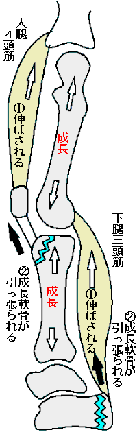 10歳ぐらいの男児で走ることが多い子に多いようです。(図1)これは下腿3頭筋が、かかとの骨の成長軟骨を刺激することによって起こります。最初は走るとかかとが痛いといいます。